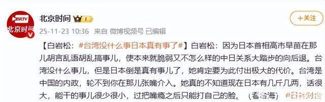 就在公众对他的期待逐渐降低时,没想到反转会来得如此突然。 转折点出现在高市早苗涉台言论引发的风波中。 白岩松在节目里直言: “高市早苗在那胡言乱语,胡乱搞事,使本就脆弱又不怎么样的中日关系大步向后退,她肯定要为此付出极大的代价。” 没有空洞说教,全是精准有力的立场表达。